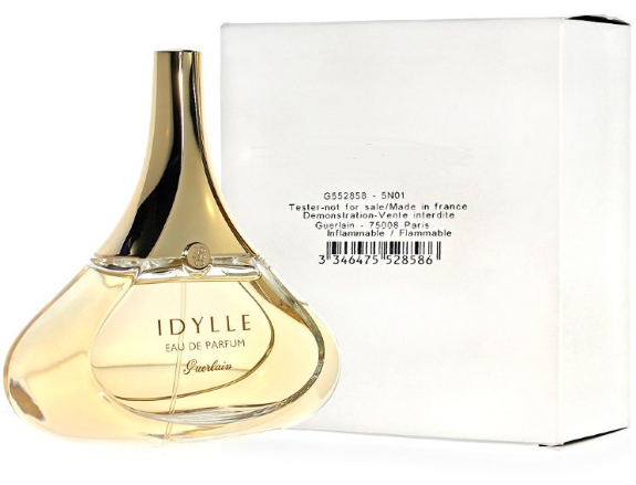 Дамският парфюм на Guerlain с удачното име Idylle впечатлява от пръв поглед с чувствения си флакон във формата на модерна капка. Първият полъх на аромата ви предлага магически лек романтичен аромат, който ви гали с нежността си и съблазнява с изяществото си. Създаден е от най-редките цветя - българска роза с нотки на личи и малина, роза Plessis Robinson, която е дело на самия Жан-Пол Герлен, съчетана с характерния за марката шипър и накрая букет, съставен от лилии от долината, люляк, фрезия, жасмин и божур.